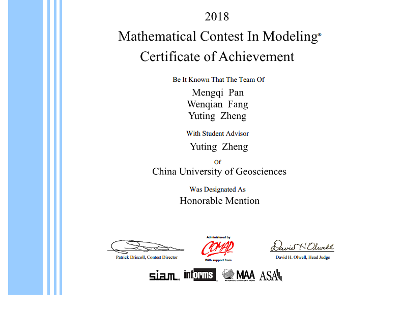 在与众多名校参赛队的激烈角逐中,公司太阳集团tyc539三名同学李贝(2016级硕士计算机科学与技术专业)、乔璐楠(2016级硕士计算机科学与技术专业)、王利宇(2017级硕士计算机科学与技术专业)获得了该项赛事一等奖(Meritorious Winner)。另外,太阳集团tyc539潘孟琦(2016级硕士计算机科学与技术专业)、数理公司方文倩(2017级硕士信号处理与智能计算)、太阳集团tyc539郑雨婷(2017级硕士计算机科学与技术专业)三位同学获该项赛事二等奖(Honorable Mention)。