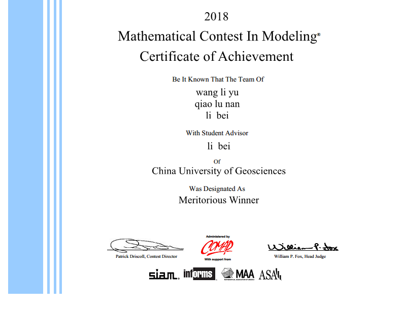 虽然当初是为了取得成绩而来,但在完成比赛之后,发现结果并不是那么重要了。在等待结果的那几天,我回想着比赛中自己的努力,发现自己已经有了很多收获:搜集资料、运用软件计算、英文阅读和写作等能力都在这四天中有了很大提高。谋事在人,成事在天。我已经努力做到最好,也就不是那么在乎结果了。最后的成绩还是令人欣慰的,我们组取得了一等奖的好成绩。得知结果时还是兴奋了许久,一份耕耘才有一分收获,这是对我们四天积累的奖赏。