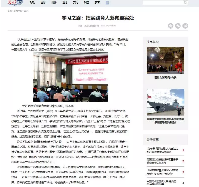 “计科先锋宣讲团”实践过程先后被国家级媒体报道3次(光明日报网、先驱日报网、现代青年网),县级媒体报道2次(红安热线、红安县校办),校级媒体报道8次(地大新闻网、CUG科协、老员工网报),共计13次,不含重复报道。