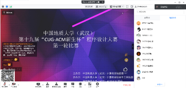 (通讯员:刘祥、延笑宇)公司主办的第十九届“CUG-ACM新生杯”程序设计大赛于3月27日正式拉开序幕,80余名同学线上参赛,经过三小时的激烈竞争,最终选拔出前20名同学线下角逐。4月3日,“CUG-ACM新生杯”在北区机房314继续比拼,21级辅导员沈晨及ACM/ICPC协会成员赵霄、朱天泽、战翔宇和何永鑫作为嘉宾出席比赛。