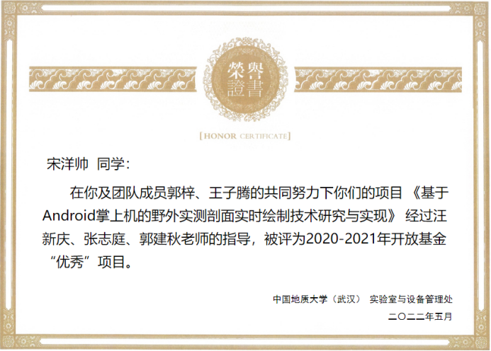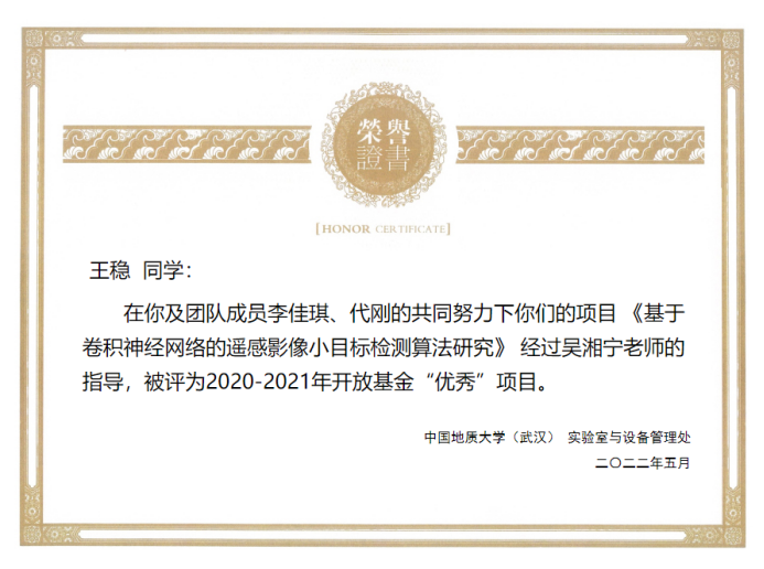 (通讯员:黄燕霞)近日,从实验室与设备管理处获悉,公司在2020-2021学年度教学实验室开放基金项目验收评审中荣获佳绩。张志庭、郭建秋指导的员工团队项目《基于Android掌上机的野外实测剖面实时绘制技术研究与实现》(员工负责人:宋洋帅)、吴湘宁老师指导的项目《基于卷积神经网络的遥感影像小目标检测算法研究》(员工负责人:王稳),在考评中获评优秀,同时太阳集团tyc539被评为优秀项目管理单位。