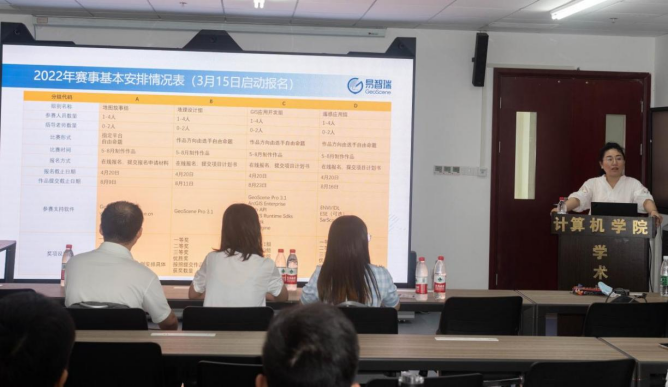 张聆女士首先就易智瑞公司以及其主办的GIS开发竞赛的基本情况做了简要介绍,随后张聆女士详细介绍了GIS开发竞赛中的各个组别(赛道)的规则要求、历史沿革。张聆女士强调,本次GIS开发竞赛以提升同学们的地理空间分析能力与GIS开发、应用能力为主要目标,以“GIS--无处不在,随处精彩”为核心思想,竞赛共设四个分组:地图故事组、地理设计组、GIS应用开发组、遥感应用组,为全国地理信息、空间信息等相关专业老员工提供了一个自我发展、自我检验的机会,也为希望在该领域继续发展的同学提供了一个接触产品商业化进程、彼此角逐的平台。