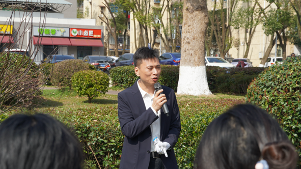 黄菊介绍植树期间注意事项。她说后勤党委对此次活动高度重视,并提供全力支持,希望双方能不断探索校企的深度融合模式,充分发挥校企协同育人优势,达成共同培养人才目标。