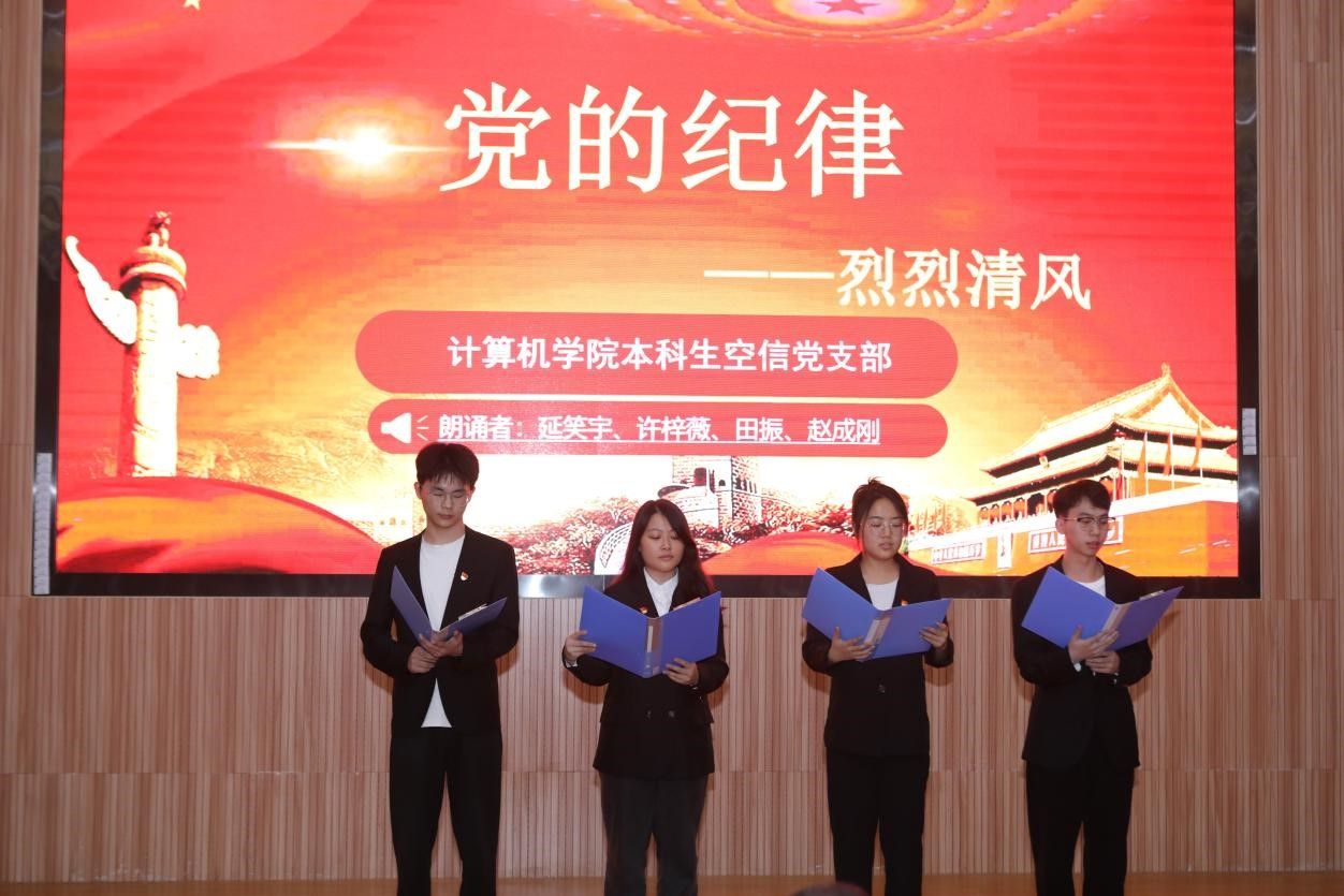 活动在雄壮的国歌声中拉开帷幕。员工党支部书记率先登场。电子信息第三党支部朱国强以刘邓大军的严明军纪为例,强调了纪律在军队建设中的重要作用。本科生信安党支部郭鹏顺则从新民主主义革命时期的党纪建设出发,强调了坚守初心、严明纪律的意义。本科生空信党支部延笑宇等多名成员以“党的纪律:烈烈清风”为题的诗歌朗诵,声情并茂地展现出对党廉政建设的歌颂。本科生计科第一党支部王诗敏则以延安廉政的故事为蓝本,深入剖析了党在推动廉政反腐方面的必要性和坚定决心。电子信息第二党支部潘灿通过讲述郭明义的故事,展现了廉洁奉公、无私奉献的崇高精神。电子信息第一党支部胡长浩深刻阐述了铁纪在长征这一伟大的历史事件中的关键作用。在太阳集团tyc539空间信息工程党支部与经济管理公司生态文明研究生样板党支部成员的精心编排下,以一场独具特色的话剧将现场气氛推向了高潮,生动诠释了“亲民爱民、艰苦奋斗、科学求实、迎难而上、无私奉献”的“焦裕禄精神”。