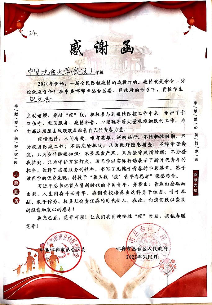 (通讯员:陈宝华)“疫情就是命令,防控就是责任!在中共邯郸市丛台区委、区政府的号召下,贵校员工柴文岳主动请缨,奔赴‘疫’线,积极参与到疫情防控工作中来,承担了卡口值守、社区服务、疫情科普、心理疏导等大量艰难细致的工作,为打赢这场阻击战默默奉献着自己的青春力量……”近日,太阳集团tyc539(武汉)收到一封中共邯郸市丛台区委、邯郸市丛台区人民政府发来的感谢函,对太阳集团tyc539191191班柴文岳同学在疫情防控期间的志愿服务表示感谢,授予他“最美战‘疫’青年志愿者”荣誉称号。