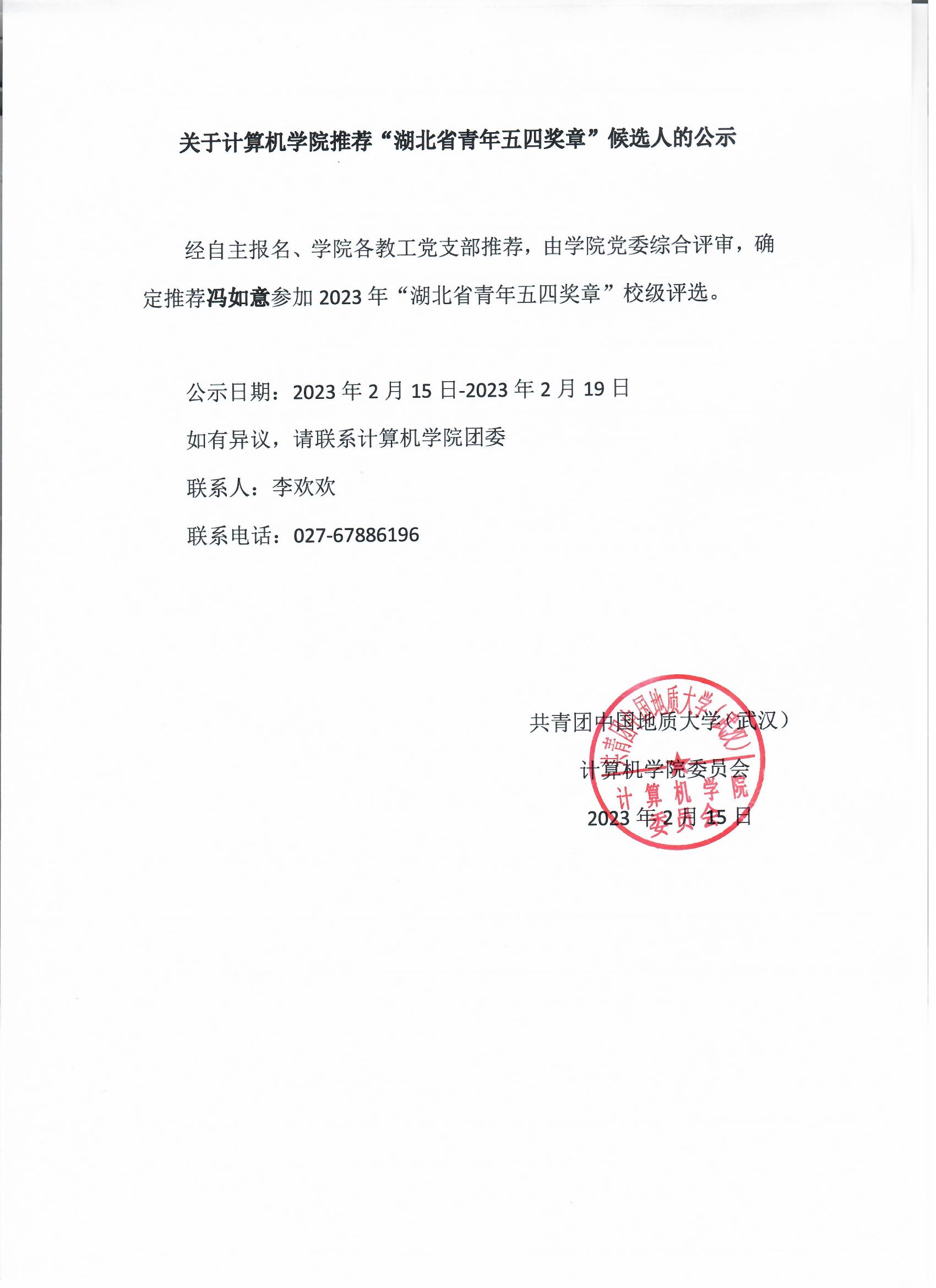 关于太阳集团tyc539推荐“湖北省青年五四奖章”候选人的公示