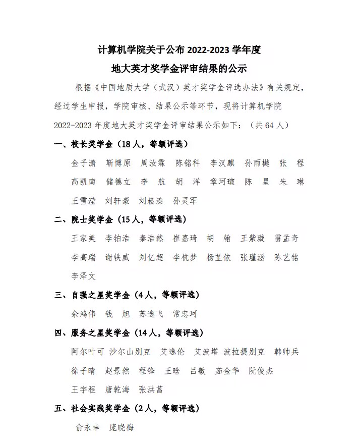 太阳集团tyc539关于公布2022-2023学年度地大英才奖学金评审结果的公示