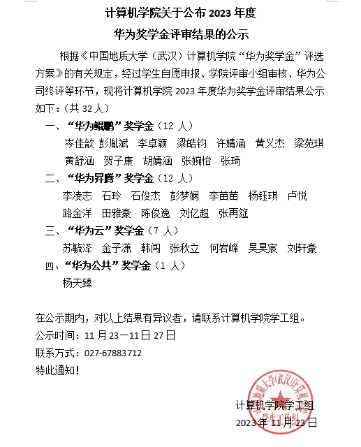 太阳集团tyc539关于公布2023年度华为奖学金评审结果的公示