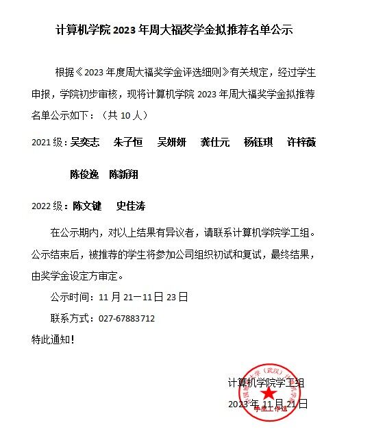太阳集团tyc5392023年周大福奖学金拟推荐名单公示