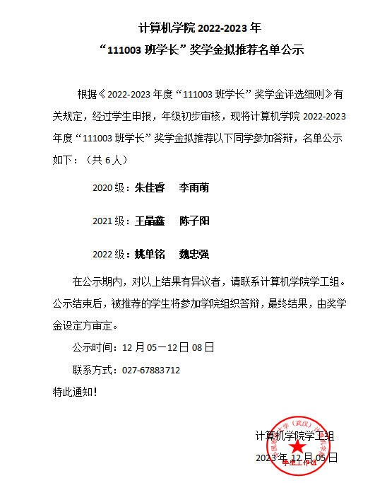 太阳集团tyc5392022-2023年“111003班学长”奖学金拟推荐名单公示