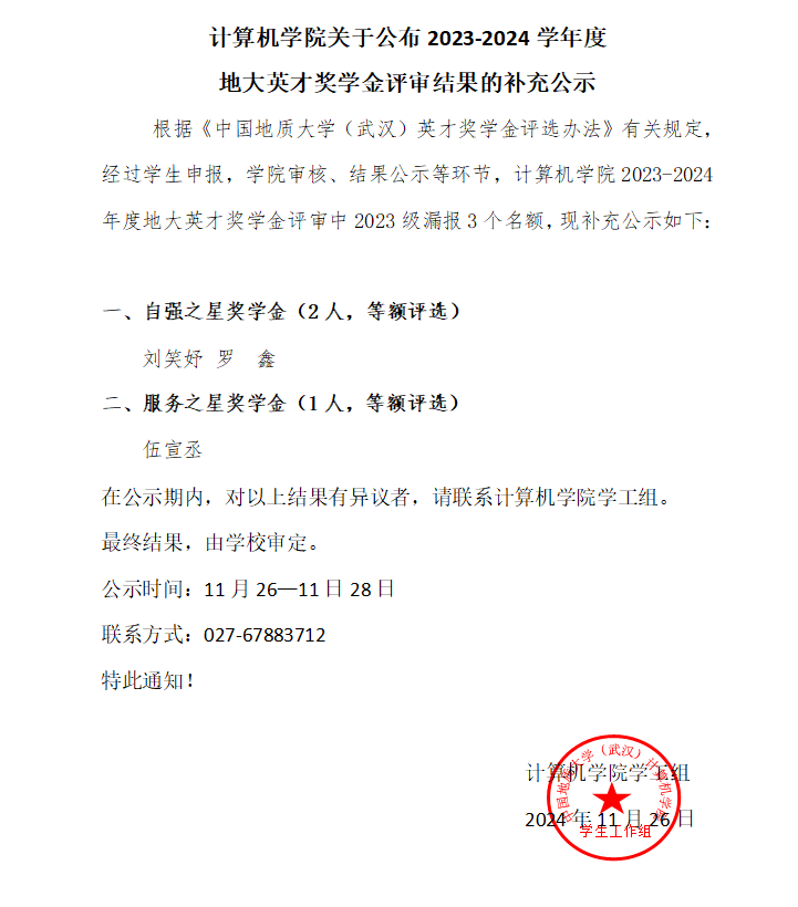 太阳集团tyc539关于公布 2023-2024 学年度地大英才奖学金评审结果的补充公示