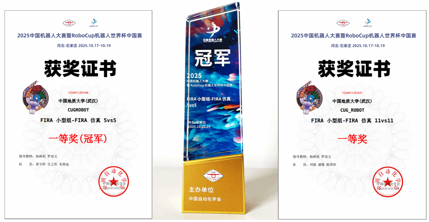 10月17日-19日,2025年中国机器人大赛暨RoboCup机器人世界杯中国赛决赛在石家庄国际会展中心浓重举行。大赛由中国自动化学会主办,河北省生态资源综合利用行业协会承办,旨在推动机器人技术前沿研究,促进产学研深度融合,为机器人和AI领域培育更多高水平创新型人才。公司CUGROBOT代表队由金牌教练杨林权老师和罗忠文老师指导,夏宇轩、王之圻、朱致远、刘培、盛梁和陈邦朴等同学组成的机器人足球代表队。经过三天的激烈竞争,我们成功卫冕了FIRA小型组-FIRA仿真5vs5赛项冠军,FIRA小型组-FIRA仿真11vs11比赛获得第四名,两项国家级一等奖。