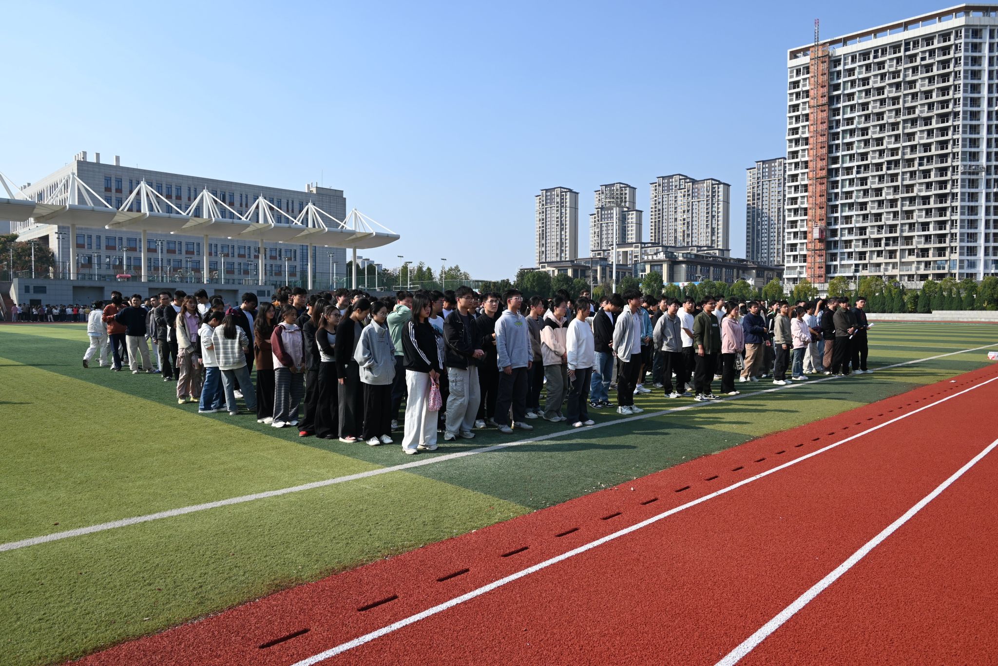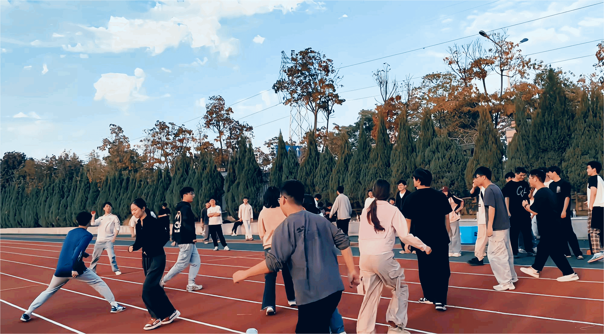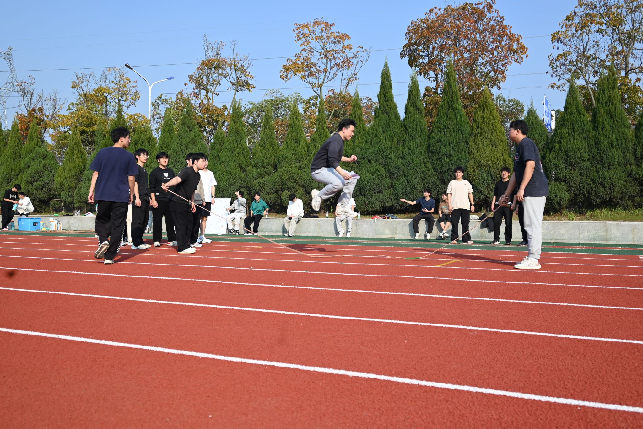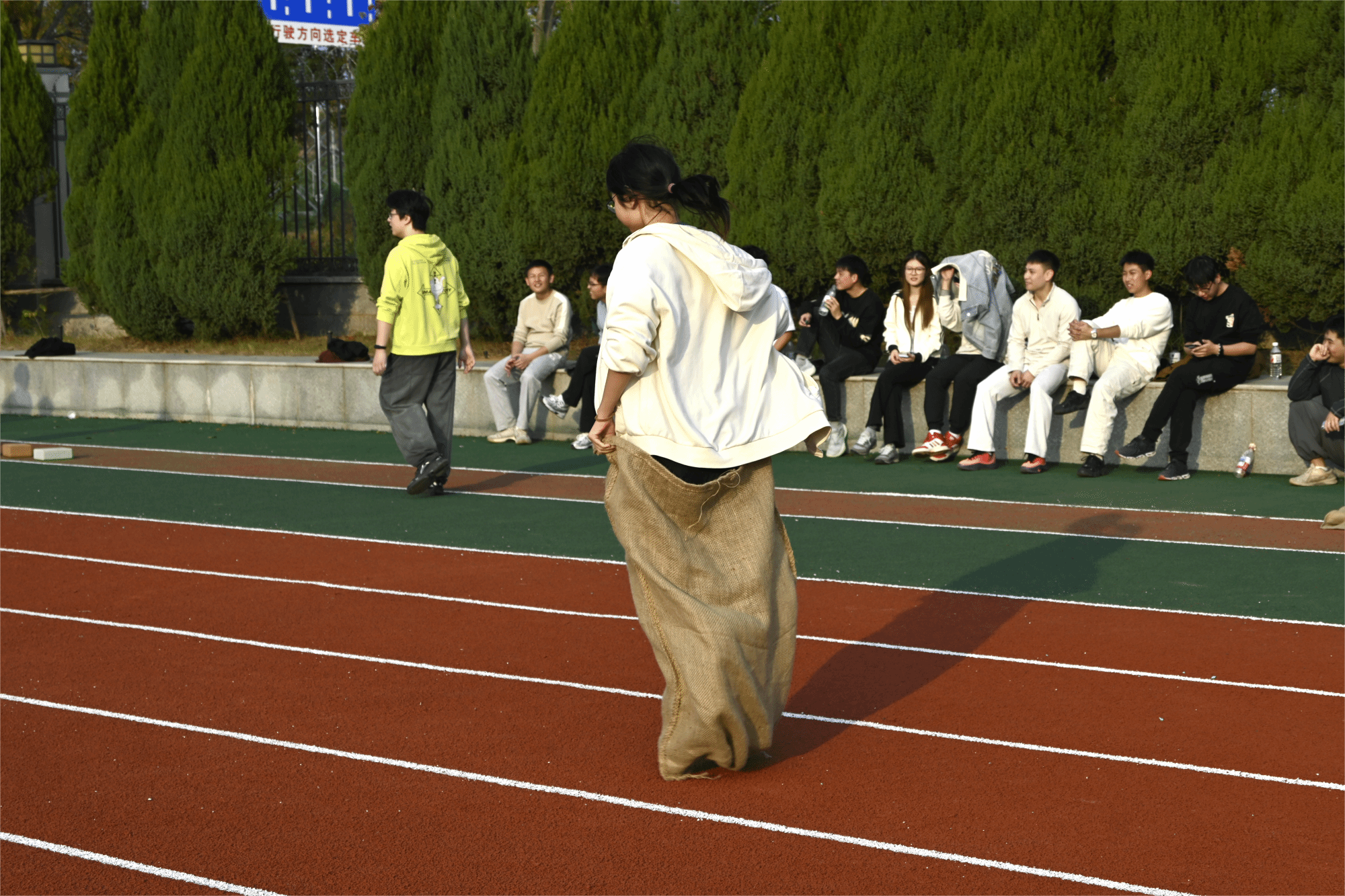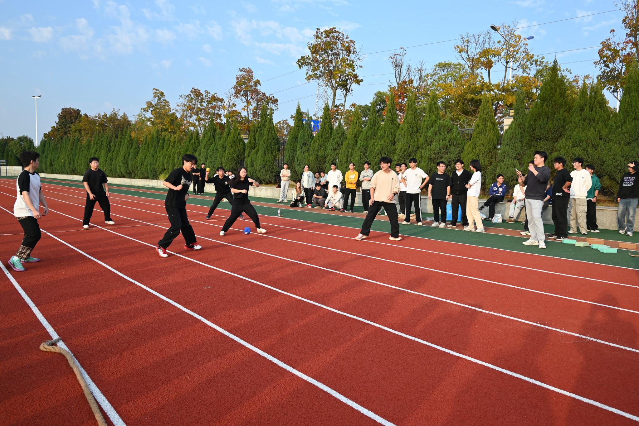随后进行两项比赛,再次将未来城校区操场上的欢笑与热情推向高潮。跳大绳的同学们脚步轻快、跃动有力,腾空的瞬间充满青春活力;而背靠背夹气球的同学们背靠背紧贴站立,稳稳夹住气球,互相支撑着向前谨慎移动,并在最后冲线的一瞬间挤爆气球,刹那间全场热烈欢呼,气氛和情绪已然到达了顶点。