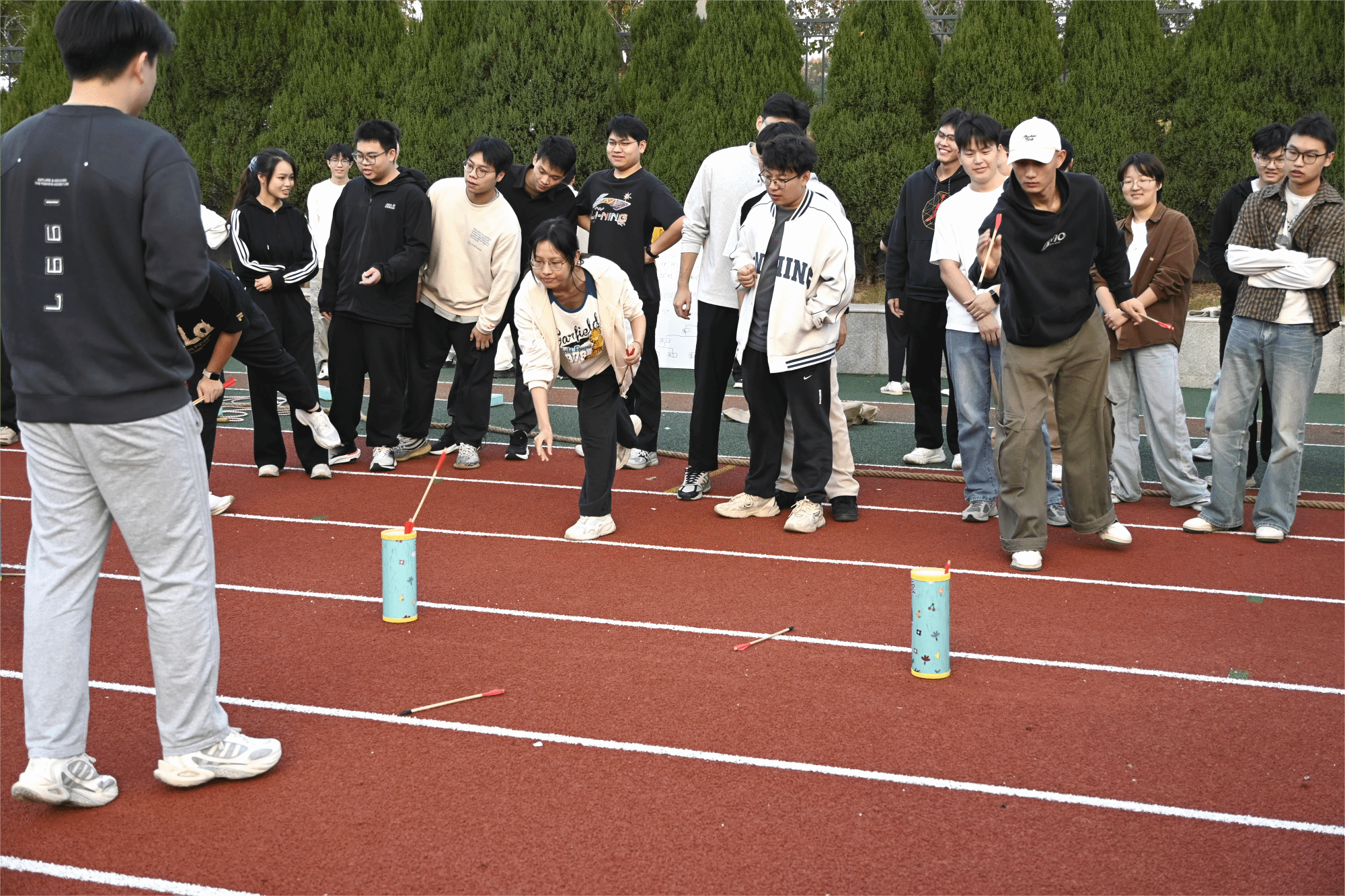 压轴的“投壶”比赛中参赛者聚精会神,力求每一次投掷的准确性。团队成员们互相商量投掷角度和力度,精心配合。比赛节奏紧凑,比分交替上升,现场掌声与喝彩声连绵不断,将活动氛围推向最高潮,也让全场都沉浸在紧张而欢快的竞赛体验中。