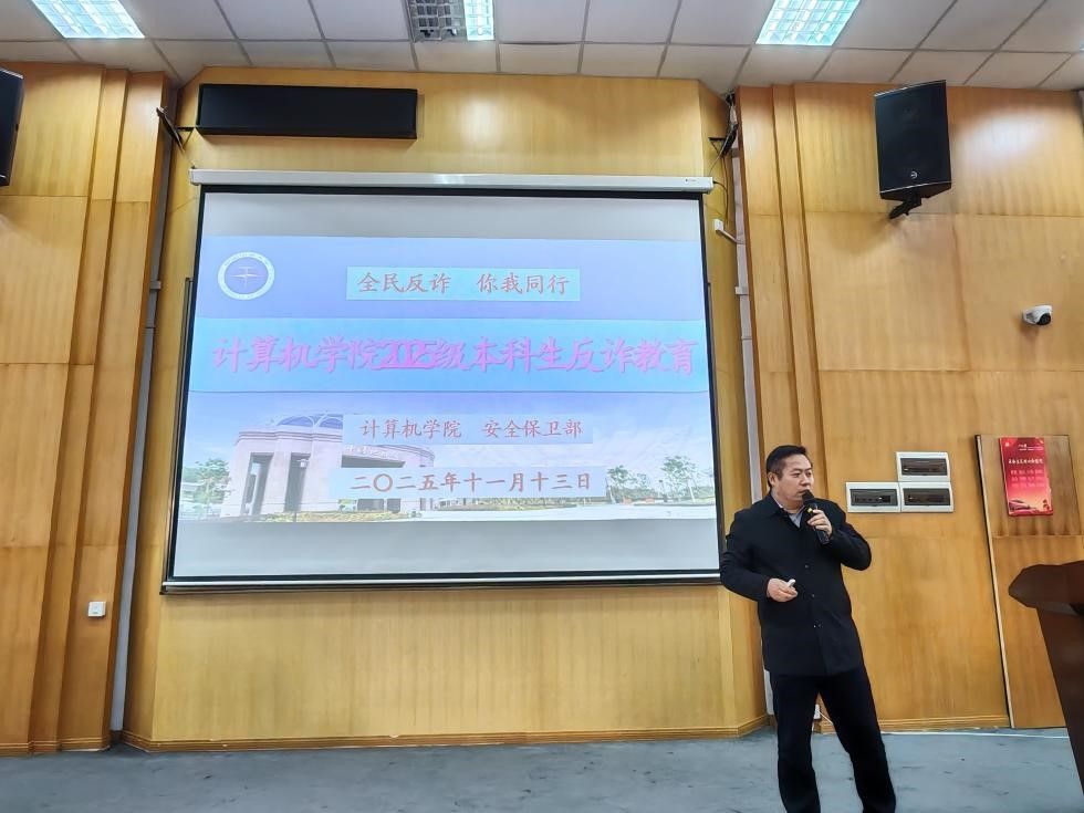 安全保卫部魏景明老师开展防诈反诈专题宣讲。他结合高校员工常见诈骗案例,从诈骗手段识别、防范技巧传授到受骗后维权途径等方面进行详细讲解,提醒同学们提高警惕,守护好个人财产安全,为安心求学筑牢安全屏障。