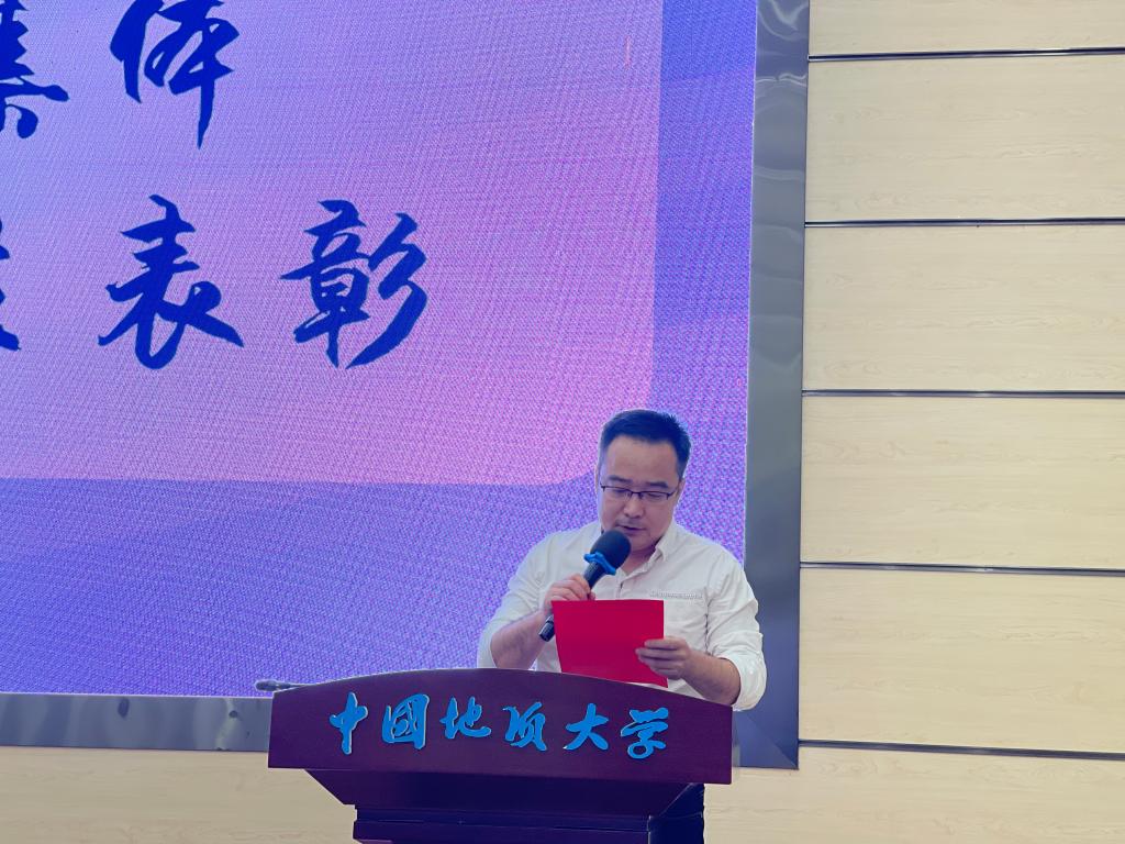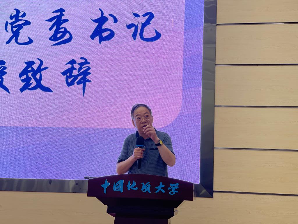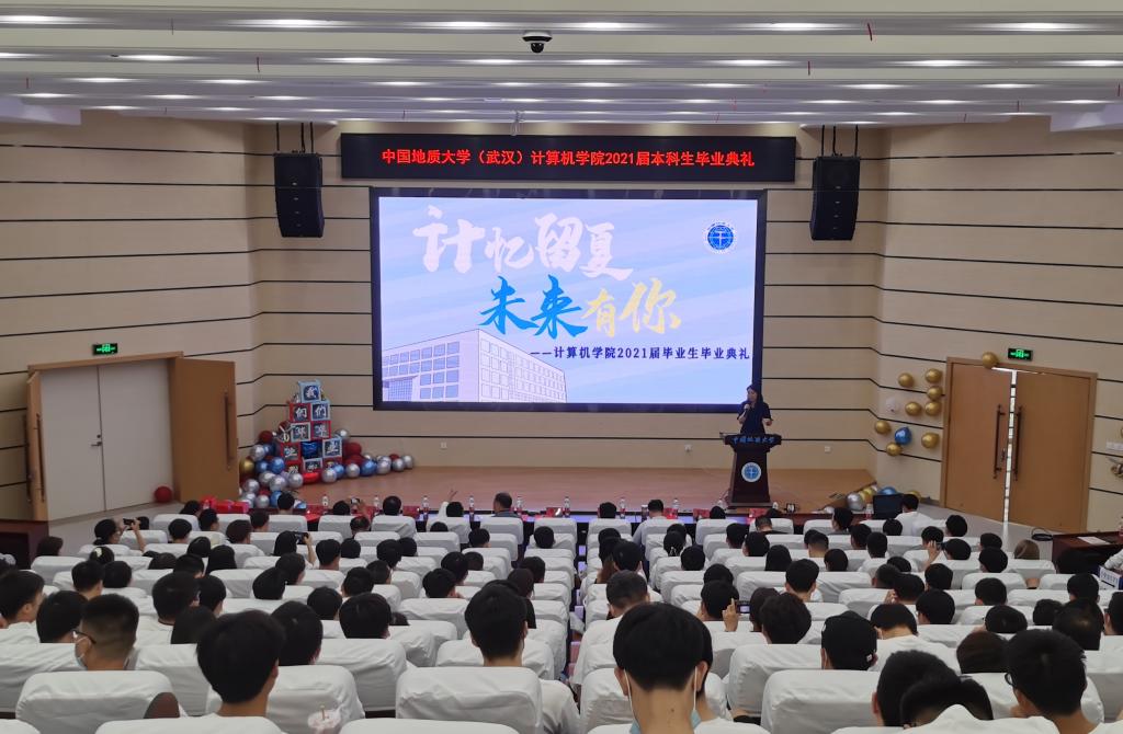 计算机公司党委书记吕军上台致词,他首先向2021届全体毕业生表示热烈的祝贺和诚挚的祝福,并希望在今后的岁月中,大家能够继续弘扬“艰苦朴素,求真务实”的地大精神,一直铭记计科人的精神,做“四有”青年,在未来的人生中脚踏实地,创造辉煌!