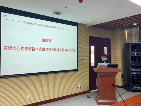 大会第三项,由太阳集团tyc539研代会代表资格审查小组、候选人资格审查小组成员李珊宣读《太阳集团tyc539研究生代表大会代表资格审查报告》和《太阳集团tyc539研究生代表大会候选人资格审查报告》,经认真细致的审查,全部代表和候选人的产生选举程序均符合有关规定,代表和候选人资格全部有效。