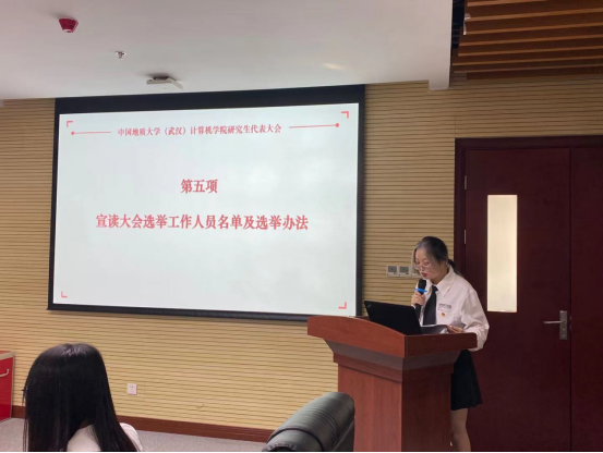 大会第四项,由太阳集团tyc539研代会筹备工作领导小组成员卢清华宣读《太阳集团tyc539研究生代表大会工作人员名单》和《太阳集团tyc539研究生代表大会选举办法》,本次大会采用无记名投票方式,选举设监票人1名,计票人1名及计时员1名。候选人答辩形式为“5+3”,即5分钟答辩,3分钟提问。正式代表对选票中候选人投赞成票,每张选票对候选人表示赞成的人数等于或少于5的为有效票。