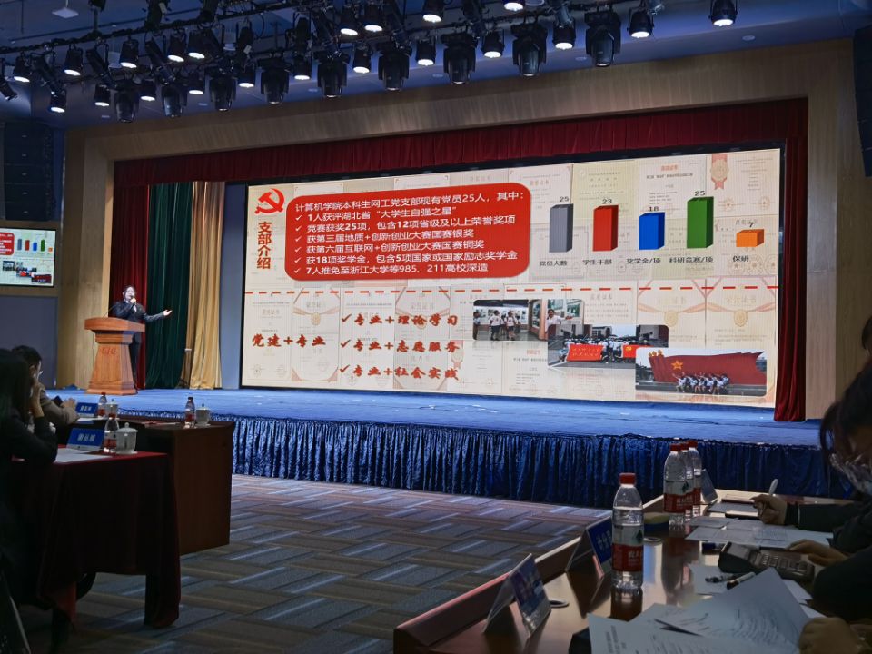 支部建设特色经验分享环节,网工党支部以“专业+党建”为主题,依托VR&AR技术打造“大武汉”线上红色军事展馆、开发神农架大九湖景区服务小程序,打造沉浸式、可互动的学习体验。饱含情感的汇报、内容丰富的PPT与支部切实有效的党建工作,获得了较高的评价。