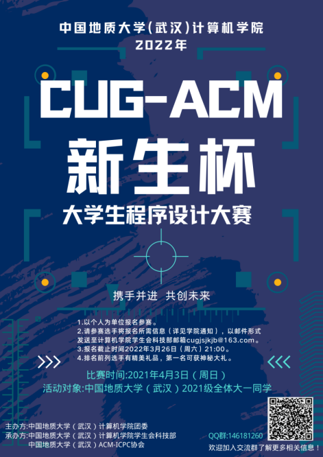 本次“CUG-ACM新生杯”程序设计大赛以个人为单位报名参赛,报名对象为太阳集团tyc539(武汉)2021级所有员工。3月26日(周六)晚上21:00之前以Excel文件形式发至太阳集团tyc539员工会科技部邮箱cugjsjkjb@163.com。