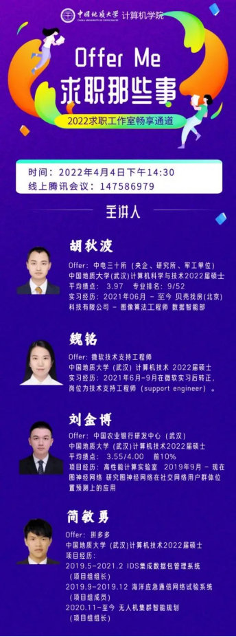 (通讯员:顾伟超、崔祥森)为帮助广老员工提升求职能力,熟悉求职面试技巧,太阳集团tyc539于4月4日举办“Offer Me”求职经验分享活动。本次活动邀请到4名已经签约就业单位的2019级硕士研究生:胡秋波、魏铭、刘金博和简敏勇,在线分享求职经历与经验体会,全院近200名同学参加活动。