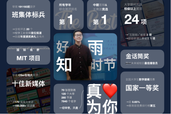 担任班长期间也是硕果累累,班级四级一次性通过率100%,国家级奖项21项,班级先后获评校级“五四红旗团支部”和校级“先进班集体标兵”(全校20个),并被选为全校唯二,未来城校区唯一的班级,为公司年度颁奖晚会制作宣传视频。