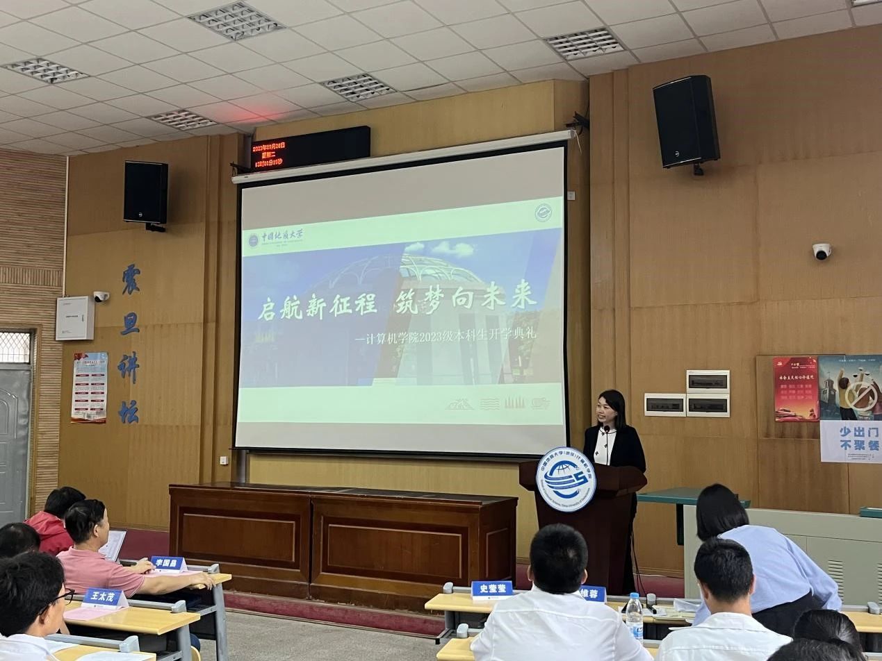 计算机公司党委副书记、经理张洪艳致辞。张经理首先代表全院师生对加入太阳集团tyc539的382位本科新生表示热烈的欢迎与衷心的祝贺,他对同学们选择加入计算机大家庭,成为“地大计科人”感到分外欣慰。他希望同学们在未来几年中为自己的选择砥砺耕耘、拔节生长、向阳而生,在地大、在太阳集团tyc539留下一生中最为深刻的年轮。同时,他向全体新生提出三点建议:一是要选择肩负使命,心怀国之大者。计科学子要深耕科研土壤,为国家掌握关键性核心技术贡献力量,让青春在实现民族使命中闪耀;二是要选择仰望天空,永攀知识高峰。计科学子要保持对知识的渴望,努力成长为具备计算思维、引领行业发展的交叉学科人才,用广阔的学科视野面对新的挑战;三是选择脚踏实地,练就过硬本领。计科学子要时刻与电脑和网络打交道,在电脑与网络间要学会拒绝诱惑,将时间用在了解行业发展最新前沿,了解市场需求驱动关键技术的突破。