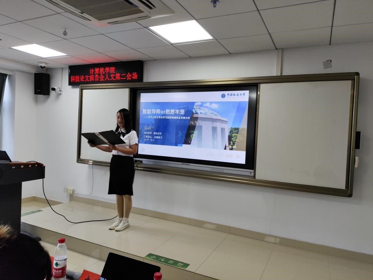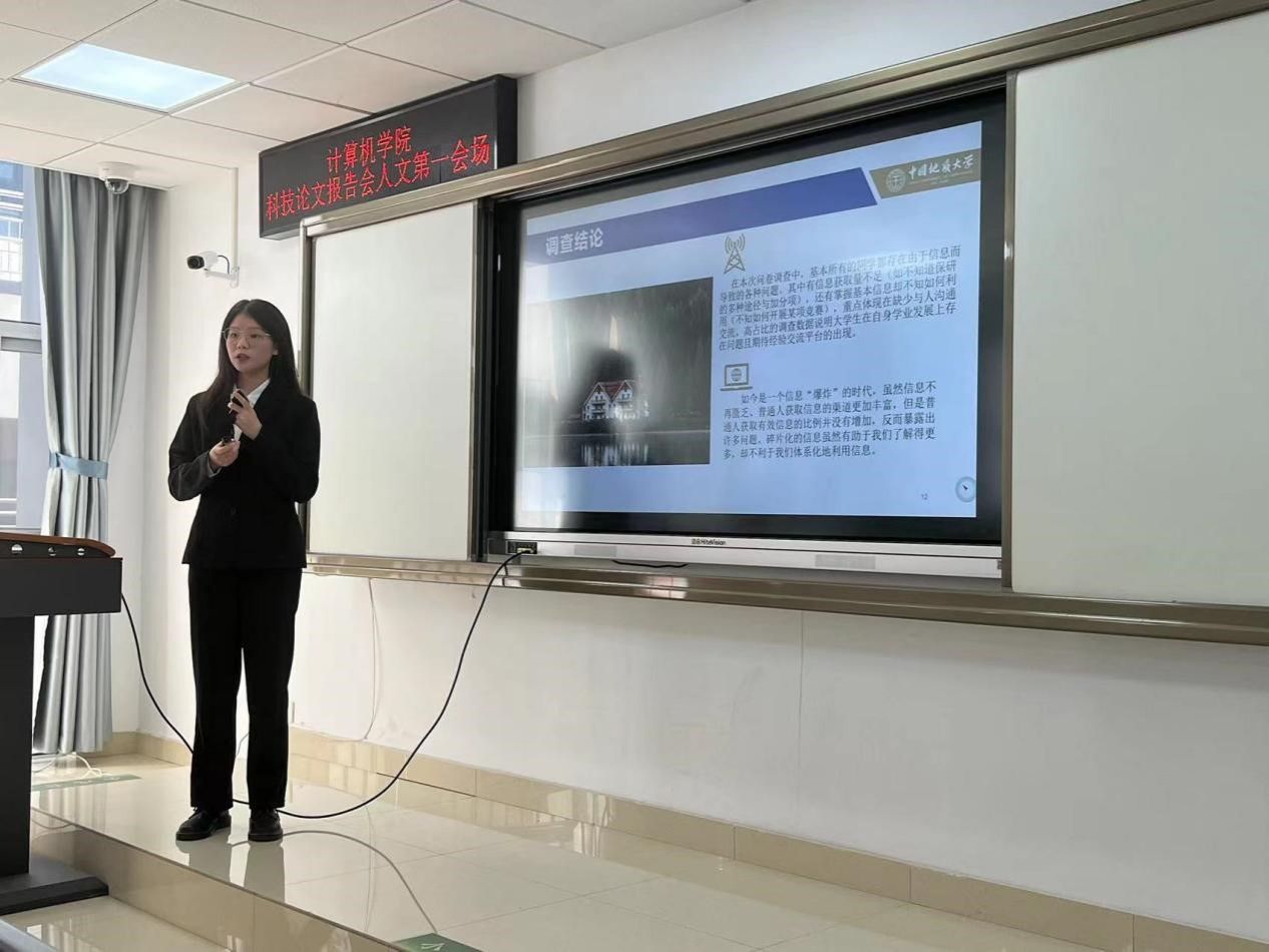 人文会场于南望山校区教学综合楼举行,有两个分会场,共25支队伍参赛。他们的主题新颖、内容饱满,论文研究深刻仔细,材料详尽准确。其中郭婷婷团队的《基于数据挖掘和情感分析的员工心理状态分析研究: 方法探究与应用展望》和董翘楚团队的《45°人生:社会变迁下的青年心态困境及其调节》运用不同的方法深入分析了当代青年员工的心理状态。王阳团队的《基于VR技术对非遗文化传承与创新的道路探索》和孙雨茜团队的《因循遵旧or守正出奇——新媒体助力传统文化“破圈”的案例分析及影响调研》都从新兴技术角度出发,探讨了如何利用创新手段保护和传承我们国家独有的传统文化,与此同时极具创新性的双问卷调研方式和数据、词频分析方式获得评委老师的一致好评。