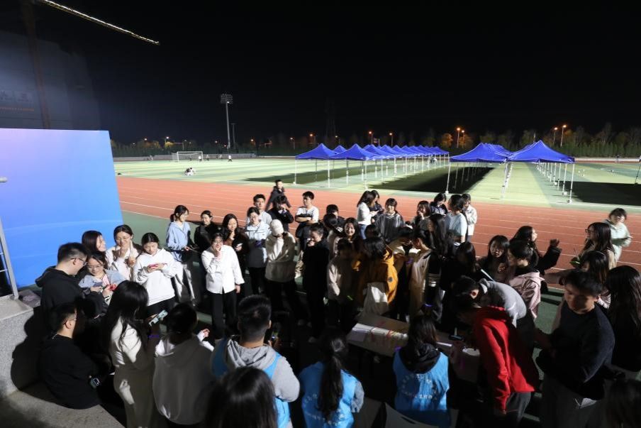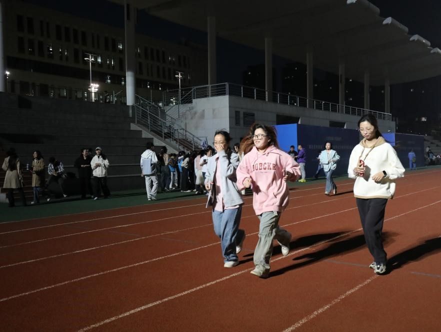 19:10,荧光夜跑正式开跑。参与者们沿着操场赛道奔跑,手中荧光手环的光芒与星光相互交织,勾勒出一道道绚丽的轨迹。不少同学打开步道乐跑APP或其他运动软件记录运动轨迹,在完成2km跑步指标后,满心期待地前往抽奖摊位,渴望赢取惊喜奖品。