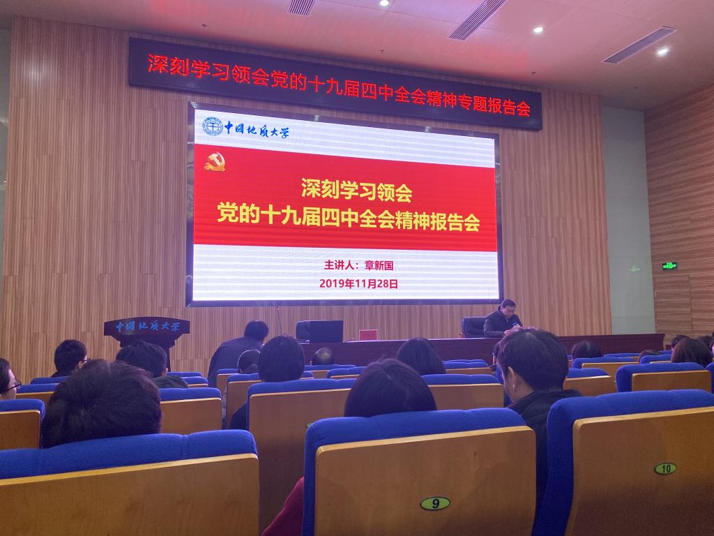 11月28日下午3点,信安支部全体党员同志在未来城校区科教楼一楼报告厅进行了“深入学习领会党的十九届四中全会精神专题报告会”的主题学习。本次报告会由公司党委副书记、纪委书记成金华支持,由湖北省委宣传团成员、湖北省委政策研究室副主任章新国同志进行了宣讲报告。