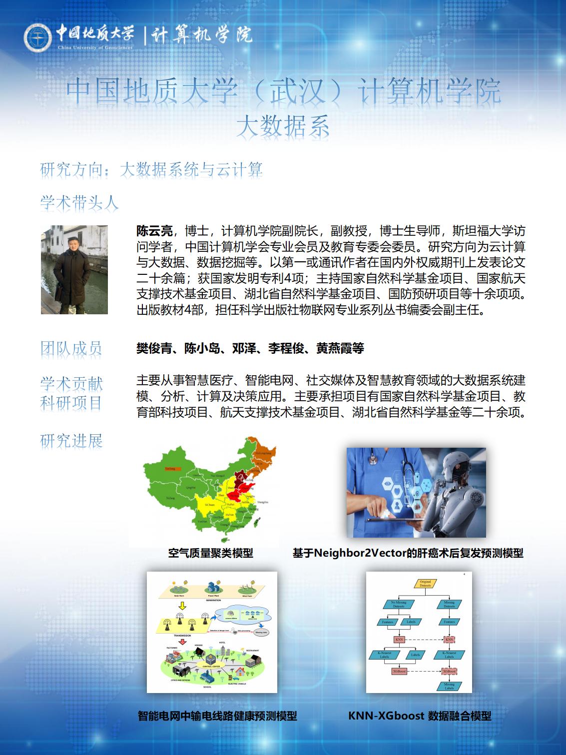 以王力哲教授、张冬梅教授、陈云亮副教授为学术带头人,主要围绕地球科学大数据原理与应用、地学大数据、大数据系统与云计算等方向开展科研工作,在地球科学大数据原理、方法及其在遥感、智慧城市、地质环境、生态、海洋等领域的应用,智能油田动态反演、多目标优化、深度学习、复杂大数据建模等,智慧医疗、智能电网、社交媒体及智慧教育领域的大数据系统建模、分析、计算及决策应用等方面取得了一系列研究成果。