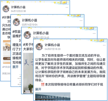 聆听同学诉求,沟通零距离。将公司权益服务平台“计算机计小益”,打造为全院员工诉求“收集站”,目前平台总关注人数达1384人,累计发送消息1307条,总浏览量达72831次。针对公司公司产品热点问题,开展院领导接待日,覆盖两校区,开展6次,研讨学风建设、教学建议。