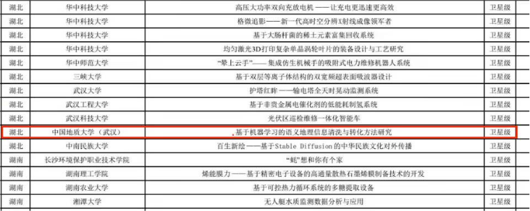 2023年9月,挑战杯“黑科技”专项赛道落下帷幕,湖北省共有三十余项目被评为国奖,“基于机器学习的语义地理信息清洗与转化方法研究”项目获“卫星奖”,我们团队上下充满幸福的味道。