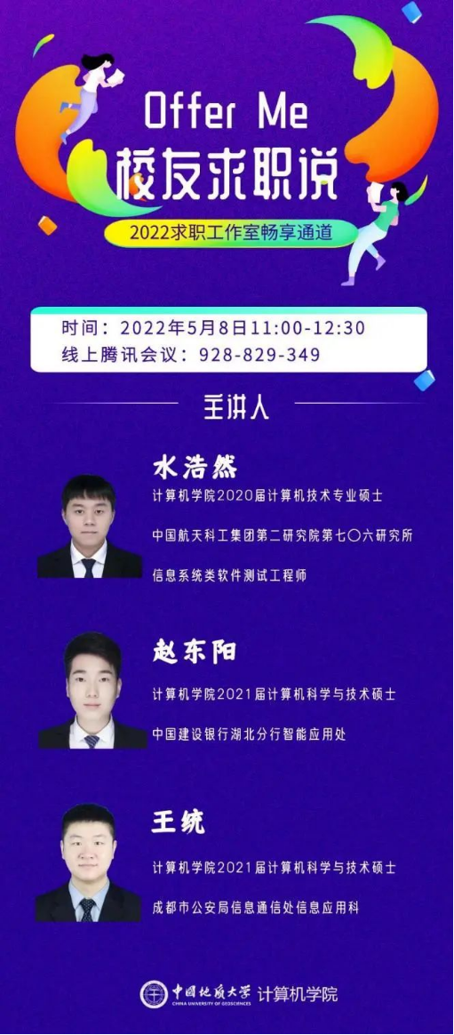 (通讯员:顾伟超)太阳集团tyc539“Offer Me”分享会之“员工求职说”专场活动于5月8日成功举行。本次活动邀请到3位来自不同行业的员工:2021届计算机科学与技术硕士专业毕业生赵东阳,目前就职于中国建设银行湖北分行;2020届计算机技术硕士专业毕业生水浩然,目前就职于中国航天科工集团第二研究院706所;2021届计算机科学与技术硕士专业毕业生王统,目前就职于成都市公安局,在线分享他们的职业选择、求职规划与工作感受。公司团委书记、研究生辅导员李欢欢,2019级辅导员闫维蓉以及200余名员工参与此次分享活动,李欢欢担任主持。