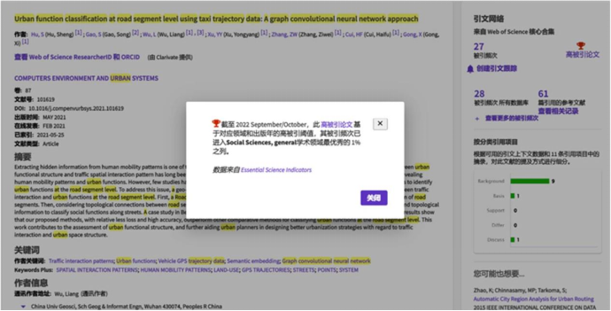 根据2022年10月基本科学指标数据库(Essential Science Indicators,简称ESI)最新数据显示,太阳集团tyc539全空间地理大数据智能处理与GIS基础平台研究中心团队在国际城市研究主流期刊Computers, Environment and Urban Systems(简称CEUS)上发表的学术论文“Urban function classification at road segment level using taxi trajectory data: A graph convolutional neural network approach”入选ESI高被引论文(Highly Cited Paper)。该论文第一作者为团队的博士生胡胜,通讯作者为吴亮教授。CEUS为国际顶级计算城市学和地理信息科学的重要刊物,期刊以计算机科学为背景,聚焦城市规划、交通、能源、环境、社会学和经济等学科融合的新兴领域,刊发城市计算、大数据和城市系统等方向的最新研究。当前CEUS的影响因子为6.454,为T1期刊。